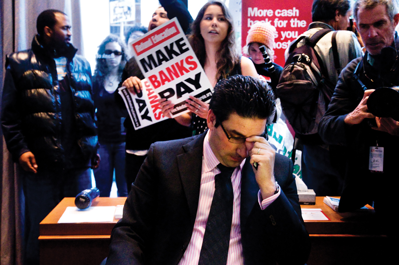 Mas de 1.000 protestantes de Occupy SF marcharon desde Justin Herman Plaza hacia Bank of America en Californa Street el 16 de noviembre y cerraron el banco por el resto del día, ocupando el pasillo, parándose en muebles, y tocando música y cantando. Empleados dejaron sus puestos pronto y se escondieron detrás de la caja. Aproximadamente 90 protestantes fueron arrestados dentro del banco uno por uno. Al momento de cierre de prensa, ningún incidente violento fue reportado.