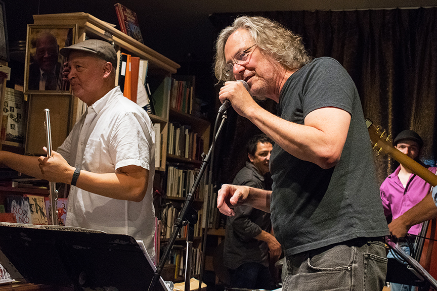 John Calloway jams on the flute on Aug. 3 during a live jazz session at Bird & Beckett Books and Records in San Francisco. Photo: Bob Hsiang
