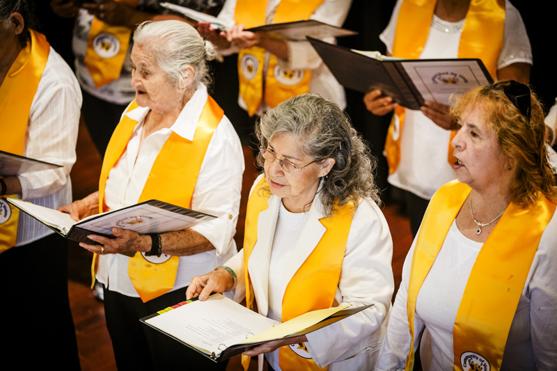 Ambos grupos, con 15 personas mayores cada uno, el total 60, se juntan una vez a la semana para una hora y media de práctica de canto. La mayoría de los cantantes no tiene experiencia musical previa, pero Martha Salazar, la directora de los dos coros, explica que no es un problema ya que están aprendiendo desde lo básico. “Les enseñamos todo: cómo cantar, cómo respirar y la postura correcta. “Ellos empiezaa sentirse orgullosos de sí mismos”, dijo Salazar.