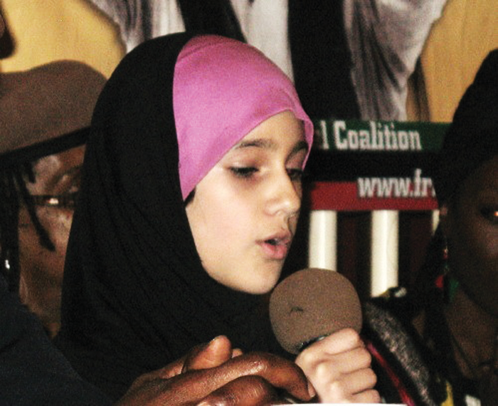 Lejla Duka, 12, hace un llamado de justicia para su padre y sus tíos del caso del Ft. Dix 5. Photo Joe Piette; Courtesy http://www.phillyimc.org