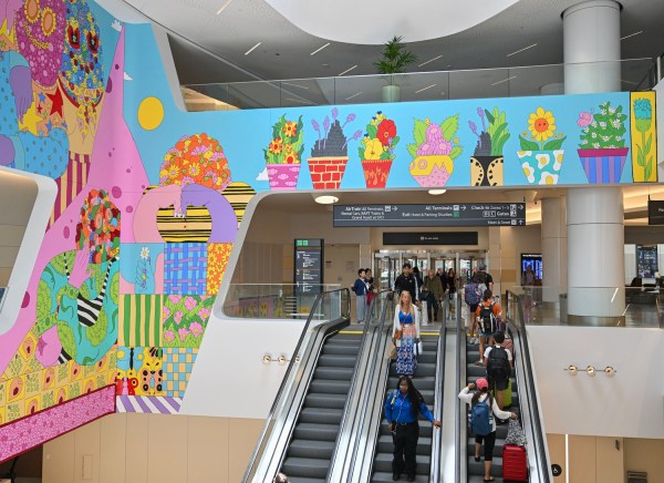 Un nuevo mural en el Aeropuerto Internacional de San Francisco rinde homenaje a las experiencias de las personas LGBTQ+. Titulada “El único azul es el cielo”, la gran obra de arte recibe a quienes llegan a la Terminal 1 de Harvey Milk con una variedad de patrones coloridos, maceteros y caras sonrientes compuestas de flores y frutas.